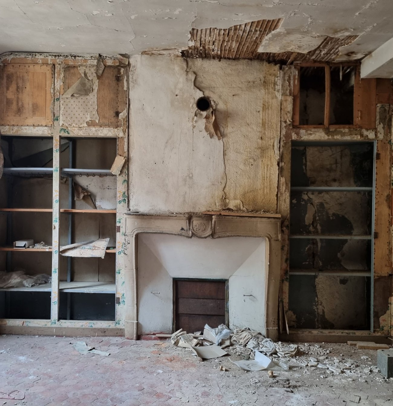La maison des échevins est en deux parties distinctes. La plus ancienne et emblématique, au fond de la cour intérieure, se trouve dans un état de délabrement avancé nécessitant d’importants travaux. Le bâtiment montre des faiblesses structurelles au niveau des murs porteurs et des charpentes, qui devront être renforcés pour assurer sa pérennité. Les intempéries et l’abandon ont contribué à détériorer les poutres, les couvertures et les tommettes au sol. Dans l’autre partie du bâtiment se trouve un escalier monumental en colimaçon, véritable chef-d’œuvre architectural incrusté dans les murs épais, qui date de l’époque.