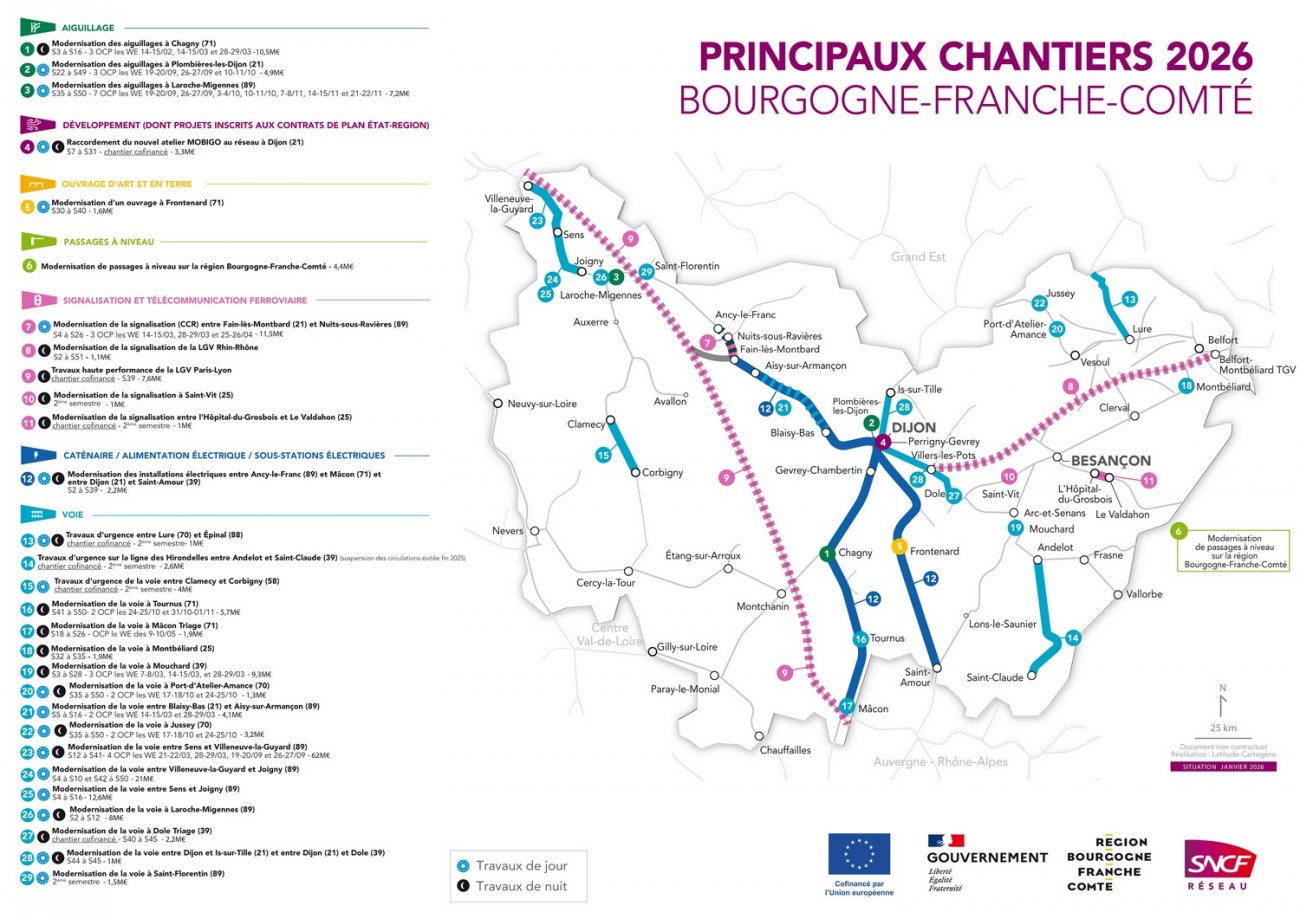 La Bourgogne-Franche-Comté compte 3.078 km de voies ferrés, ce qui représente 10% du réseau national ou autant que le réseau suisse. Filiale du groupe SNCF, SNCF Réseau continue d'investir pour moderniser ces voies : l'opérateur prévoit d'engager 300 millions d'euros en 2026.