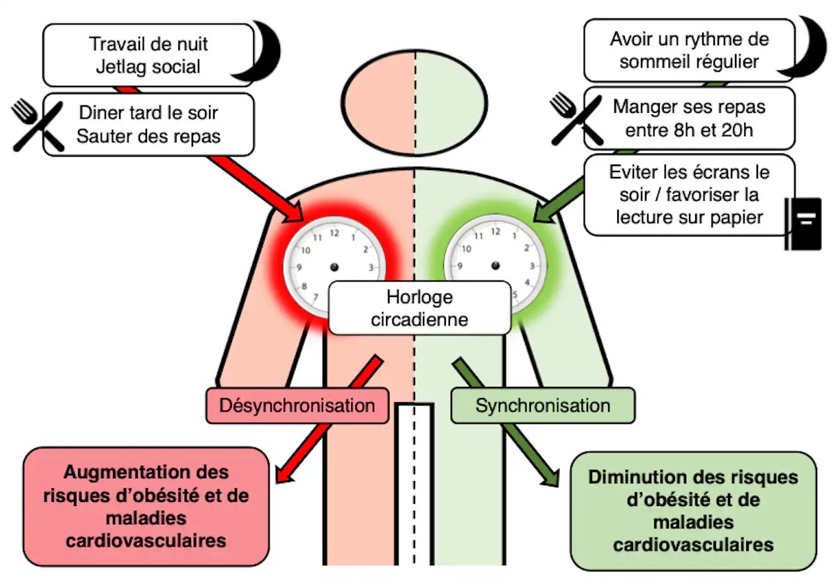 De nombreuses études scientifiques ont montré que vivre en décalage avec les rythmes circadiens, notamment en mangeant tard le soir, où en décalant son rythme de sommeil, augmentait le risque de développer des maladies cardio-vasculaires, une obésité ou un diabète de type 2.