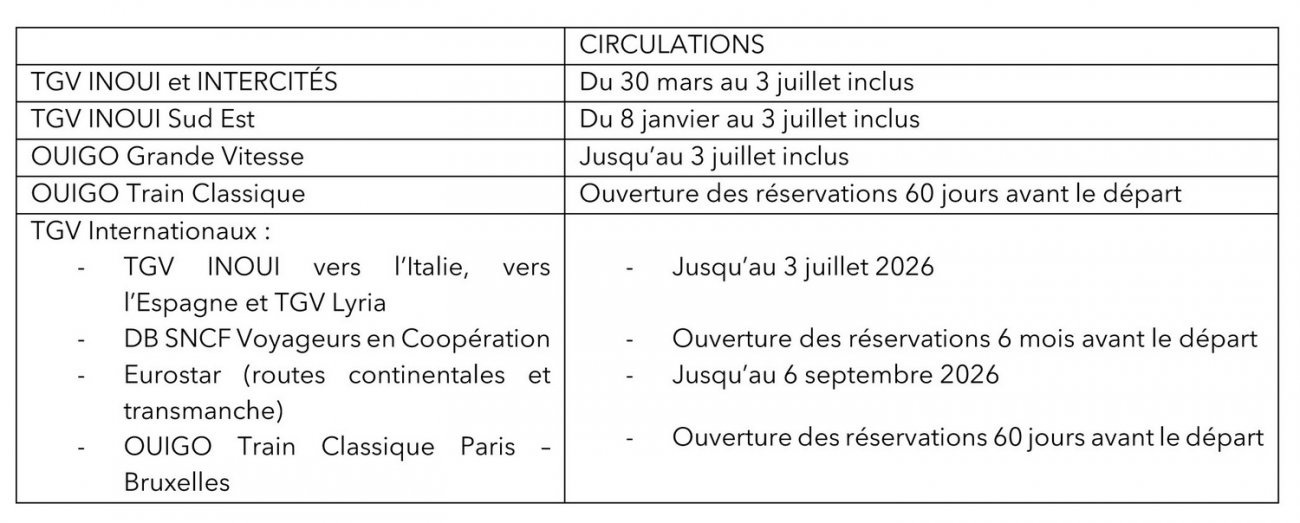Communiqué de SNCF Voyageurs du 28 janvier 2026 :Depuis le 28 janvier, les billets TGV INOUI et INTERCITÉS sont disponibles à la vente pour des circulations allant du 30 mars au 3 juillet inclus. Les destinations internationales, OUIGO Grande Vitesse et TGV INOUI Sud-Est sont quant à elles déjà ouvertes.