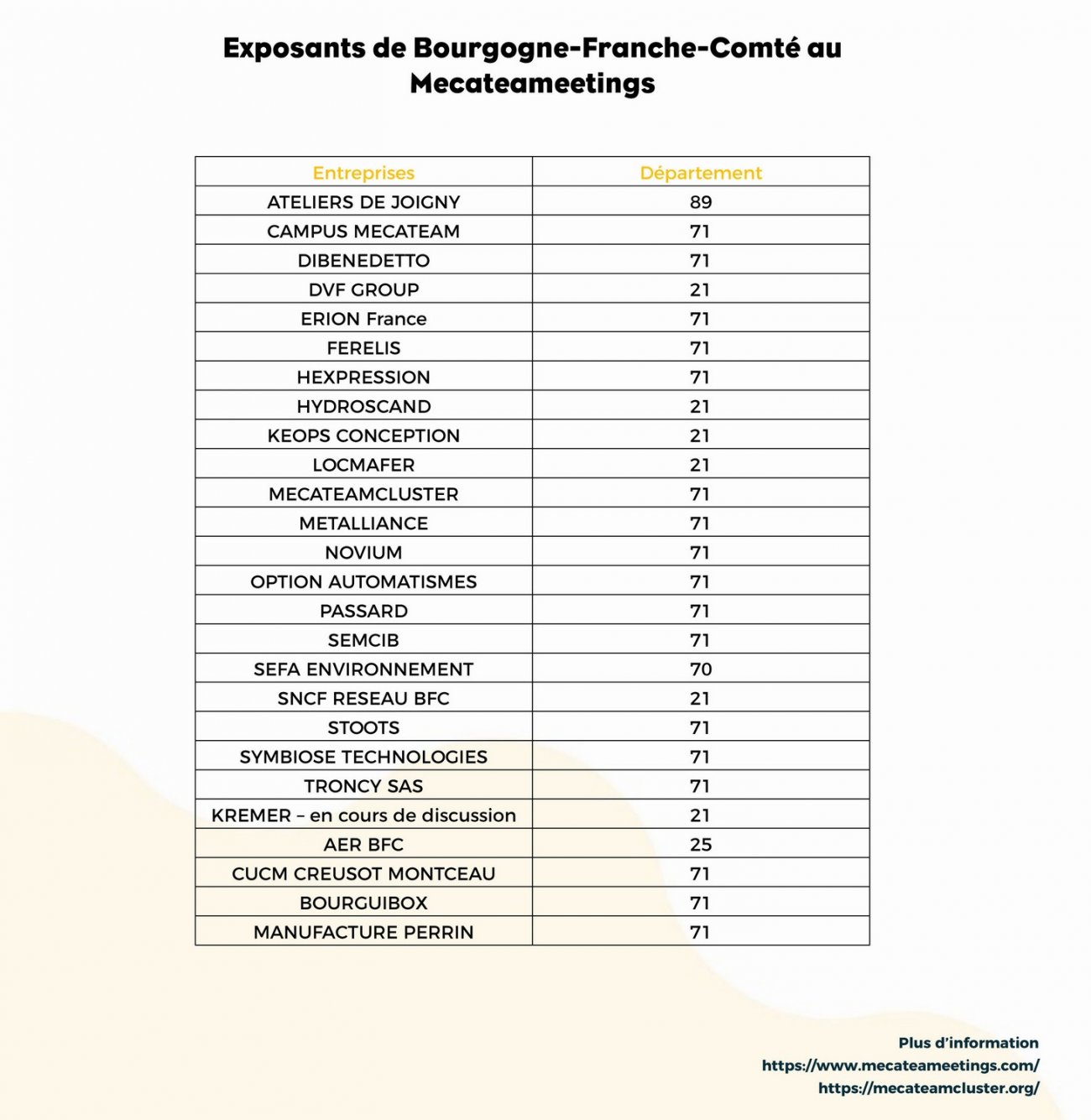 La participation régionale au salon Mecateameetings s’inscrit dans le cadre du programme d’actions collectives à l’international. Ce programme constitue l’un des axes forts des actions de la collectivité en faveur du développement des entreprises à l’export mis en œuvre par la Chambre de Commerce et d’Industrie de Bourgogne-Franche-Comté.