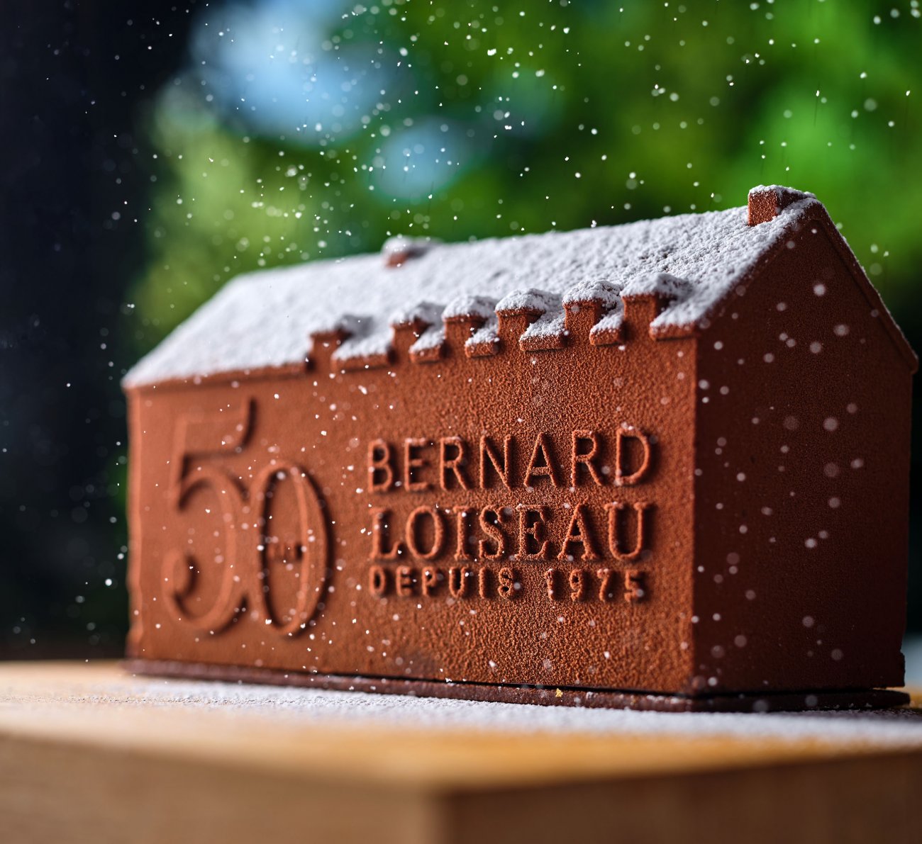 La bûche est entièrement réalisée avec le chocolat Bernard Loiseau signature *, spécialement créé pour les maisons