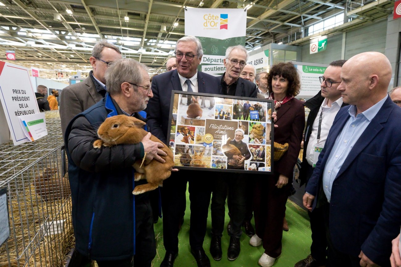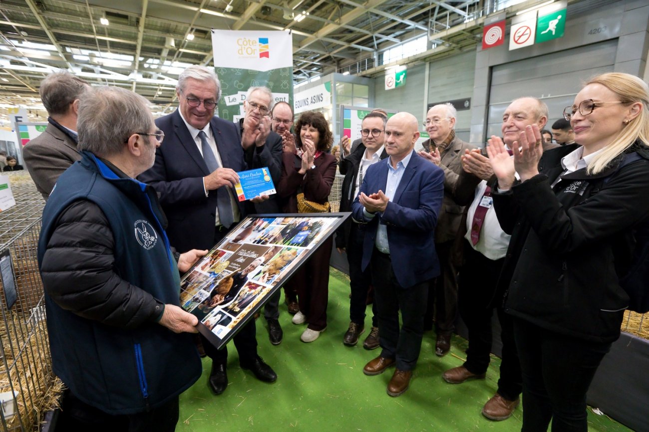 De plus, François Sauvadet a salué symboliquement la 50ème participation de l'éleveur de la haute Côte-d'Or au Salon de l'agriculture en lui remettent une rétrospective de son parcours en photographies.
