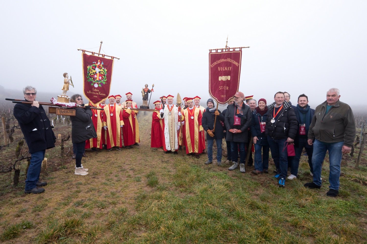 Ce samedi 24 janvier, dans les Maranges, les chevaliers du Tastevin et les membres du comité d'organisation de la Saint-Vincent tournante de Volnay ont posé symboliquement côte-à-côte.