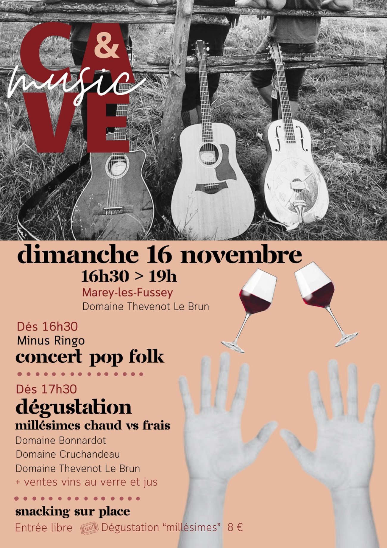 Après une première édition pleine de succès, c’est reparti pour la 2e édition de « Cave&Music » ! Danièle, Julien et Nicolas, trois vignerons basés au cœur des Hautes Côtes, vous invitent à partager leurs deux passions : le vin et la musique. Dans une ambiance simple, chaleureuse et sans chichi, venez prendre le temps de vous poser, de déguster et de vibrer ! Le groupe Pop-Folk Minus Ringo jouera en live au cœur de la cave du domaine Thevenot-Le Brun.