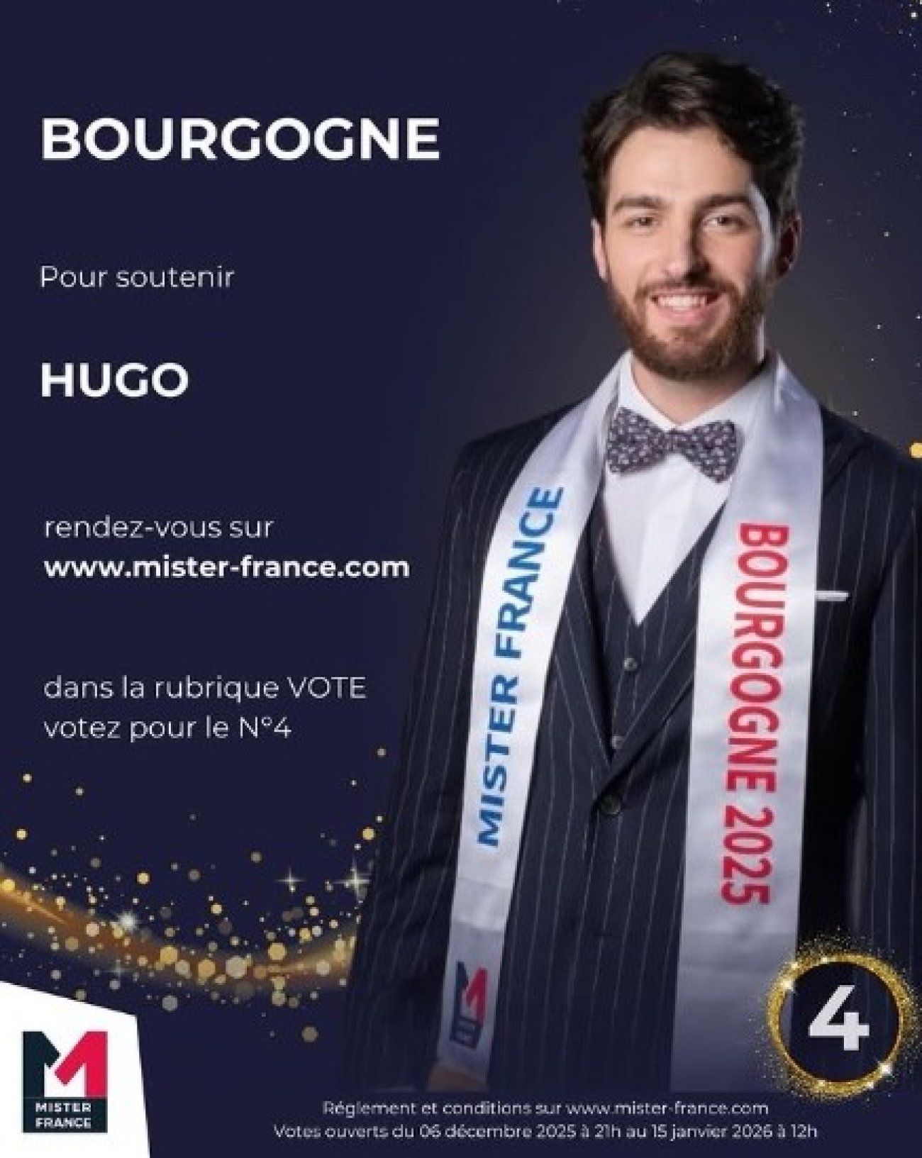 Mister-France.com Pour Hugo Demoury, Mister France Bourgogne 2025, il faut voter : candidat numéro 4.