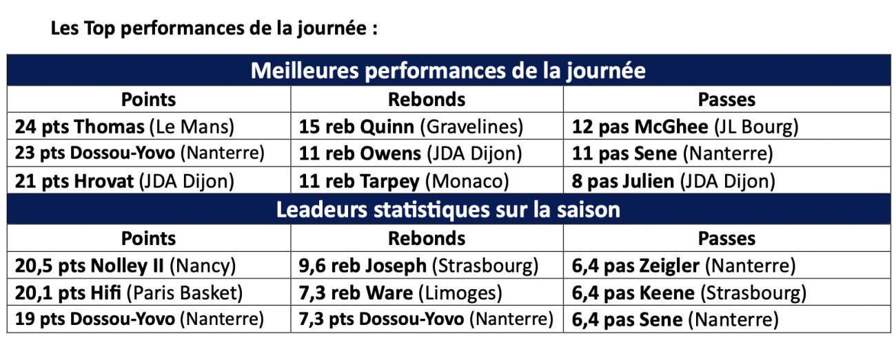 Lors de la prochaine journée la JDA Dijon se déplacera sur le parquet de Boulazac et l’Elan Chalon recevra Nancy.