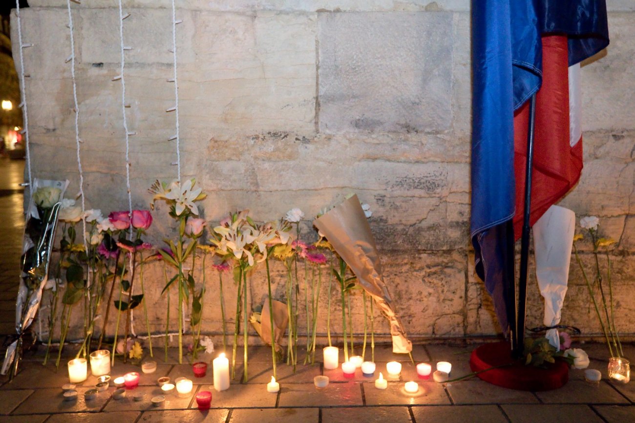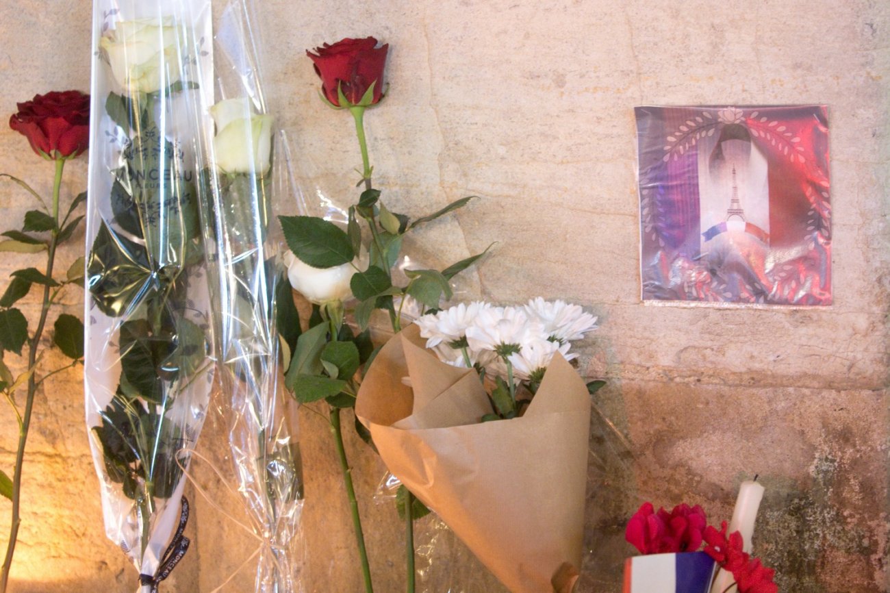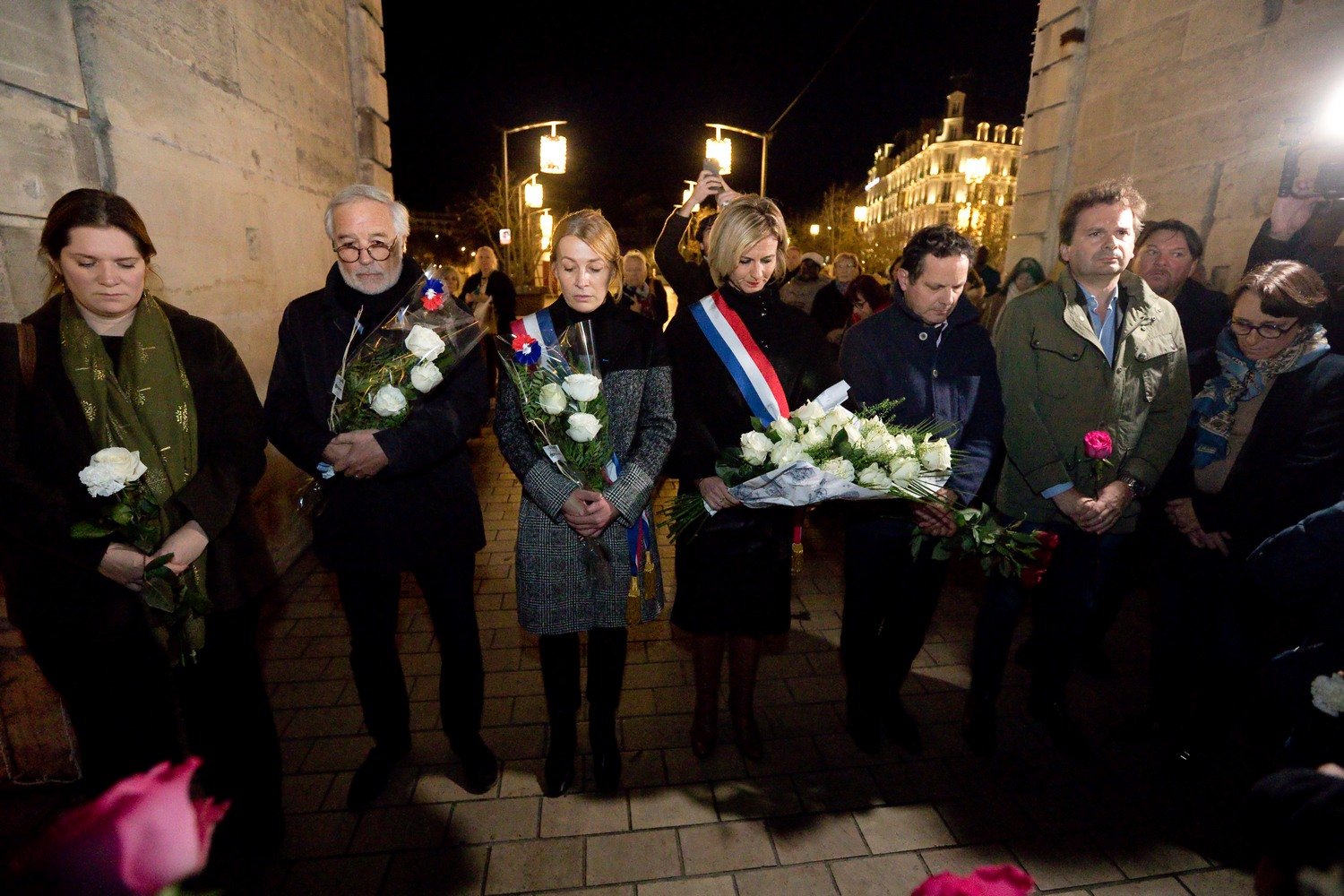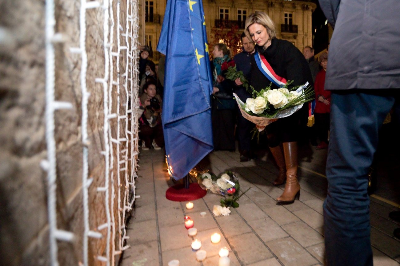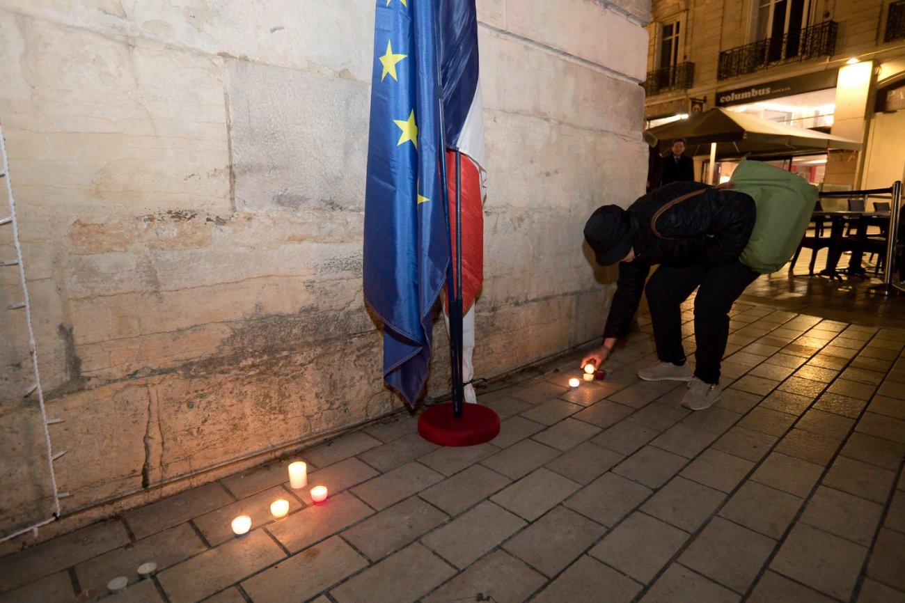 Après une minute de silence et le chant de «La Marseillaise», les participants à l'hommage ont déposé des fleurs et des bougies aux pieds de drapeaux français et européens positionnés de part et d'autre de la porte Guillaume.