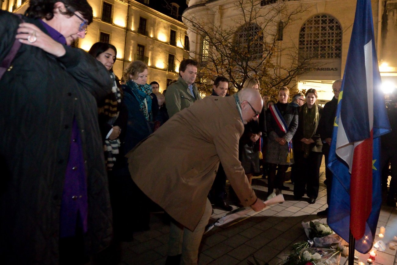 «Il y a dix ans, jour pour jour, la France était frappé en plein cœur, le 13 novembre, 2015, à Paris, au stade de France, sur les terrasses et au bataclan», a déclaré Nathalie Koenders, sans micro, à l'intention des personnes rassemblées. «La barbarie a ôté la vie à 130 innocents, dont un Dijonnais, auquel on pense bien fort ce soir, Fabian Stech.»