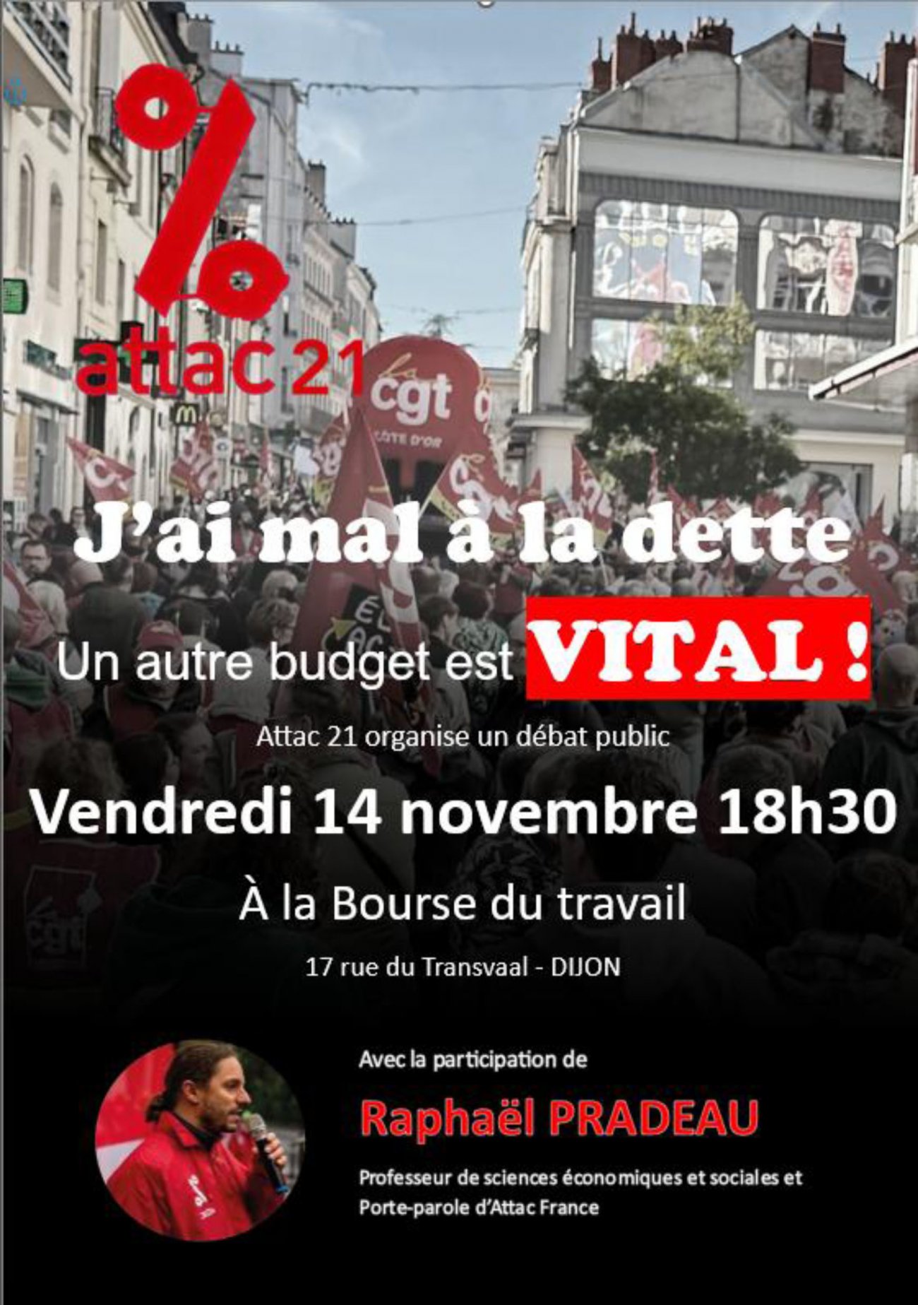 Communiqué d'ATTAC 21 du 6 novembre 2025 :ATTAC 21 a convié Raphaël PRADEAU, économiste et porte parole de ATTAC France, pour un débat public "J'ai mal à la dette! un autre budget est vital!"