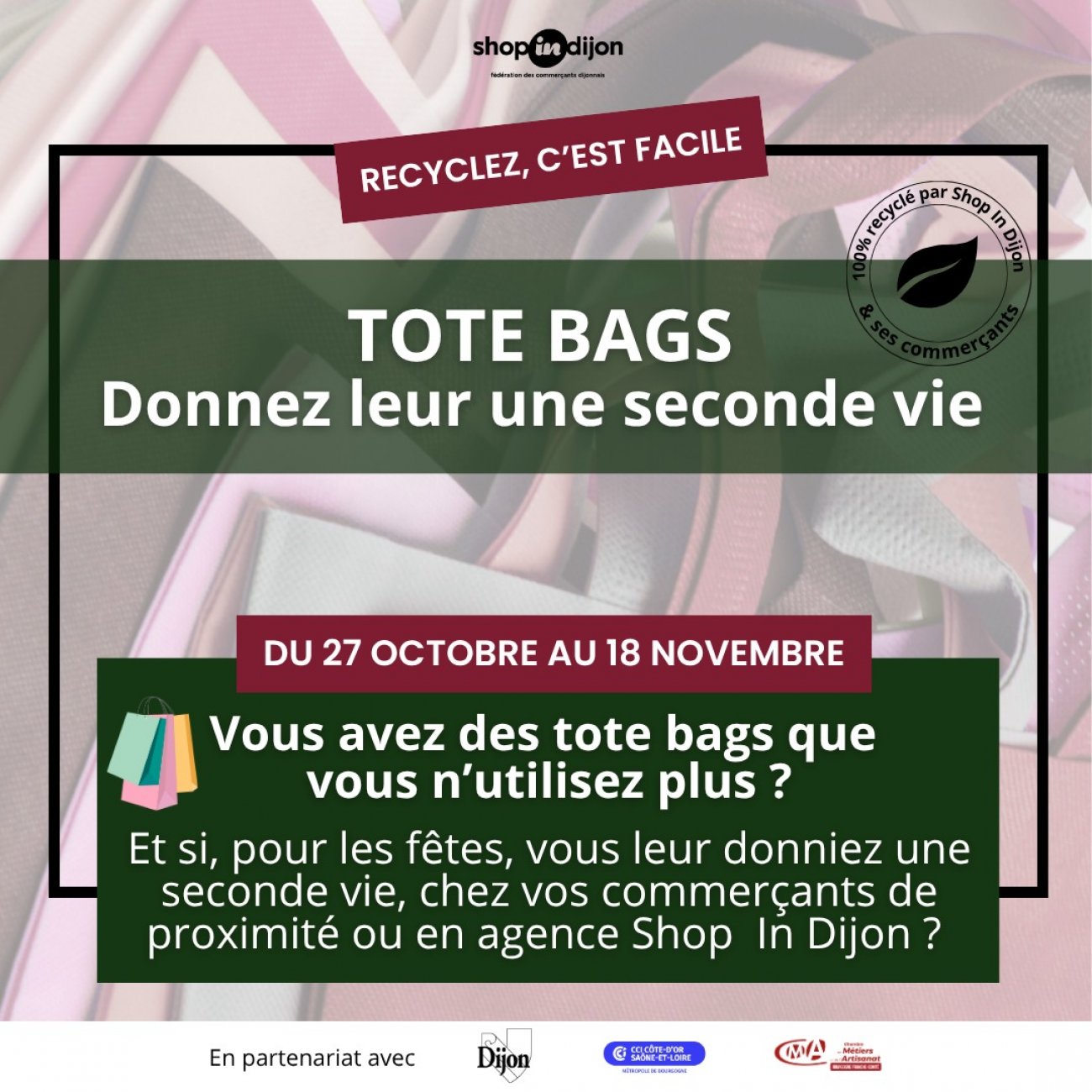 Du 27 octobre au 18 novembre 2025, il sera possible de déposer des tote-bags, en bon état général (peu importe la marque ou le design de celui-ci) dans une boutique partenaire ou à l’agence shop In Dijon pour recyclage.