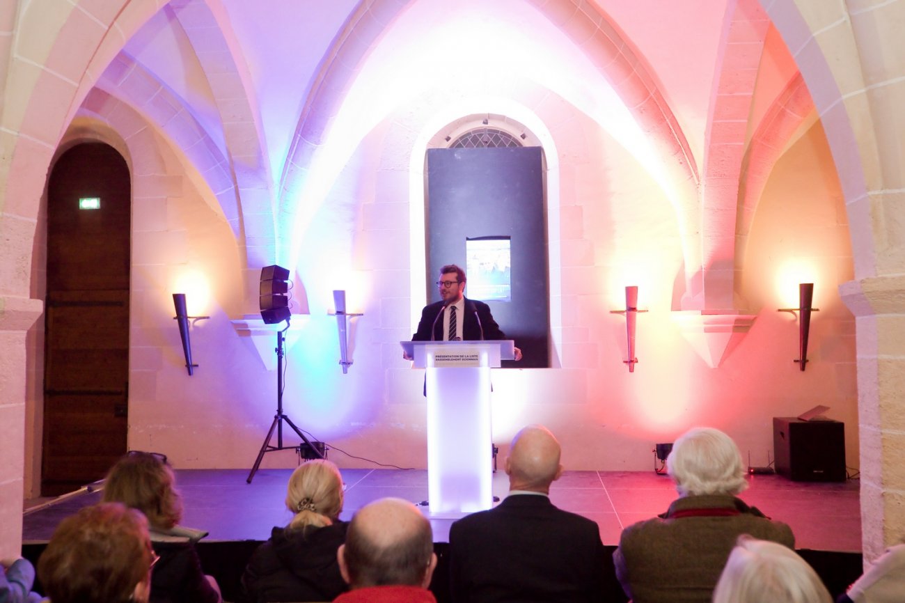 Premier à prendre la parole – éclairé à contre-jour en bleu-blanc-rouge, dans un cellier de Clairvaux à la lumière tamisée –, Antoine Camus (IDL) salue l'équipe de campagne.