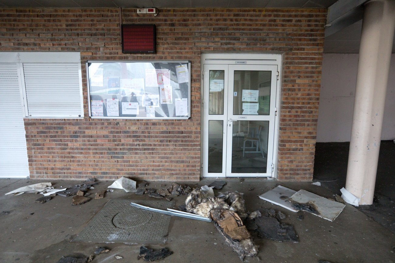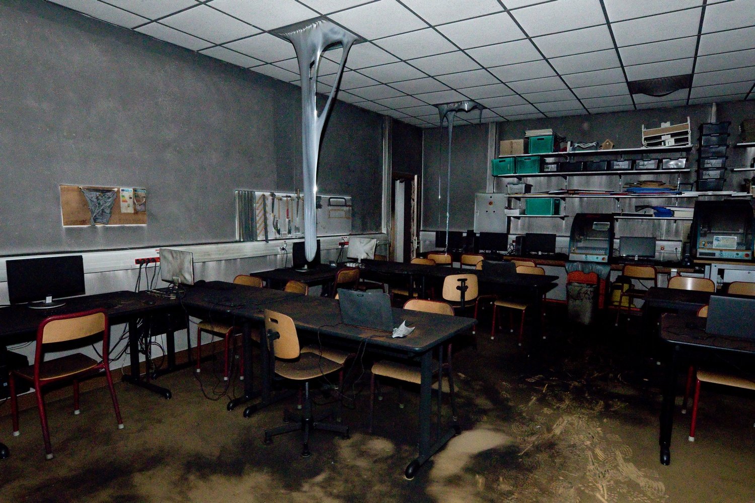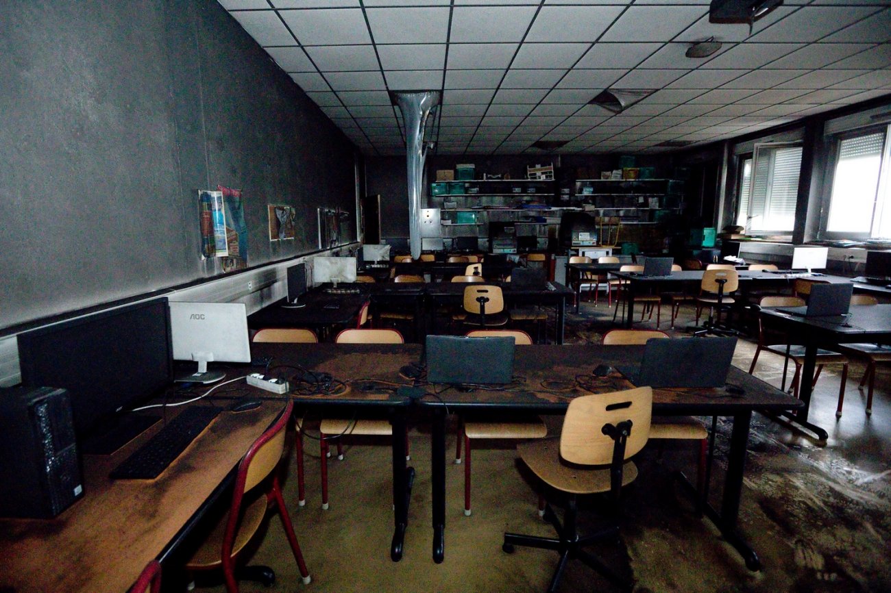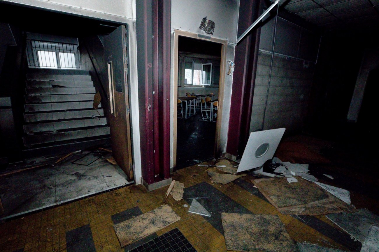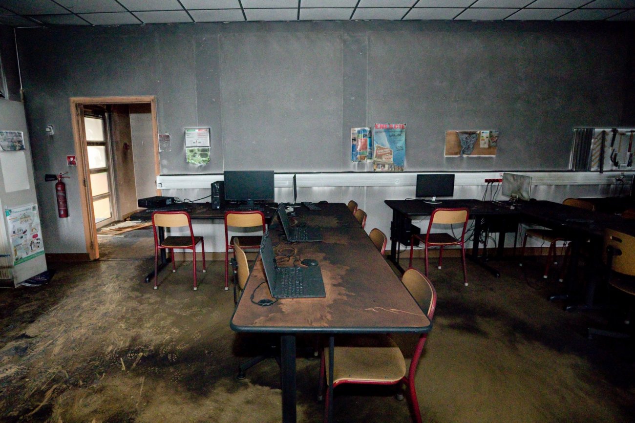Le couloir du rez-de-chaussée est ravagé et plusieurs salles – dont la salle de technologie – sont très endommagées.