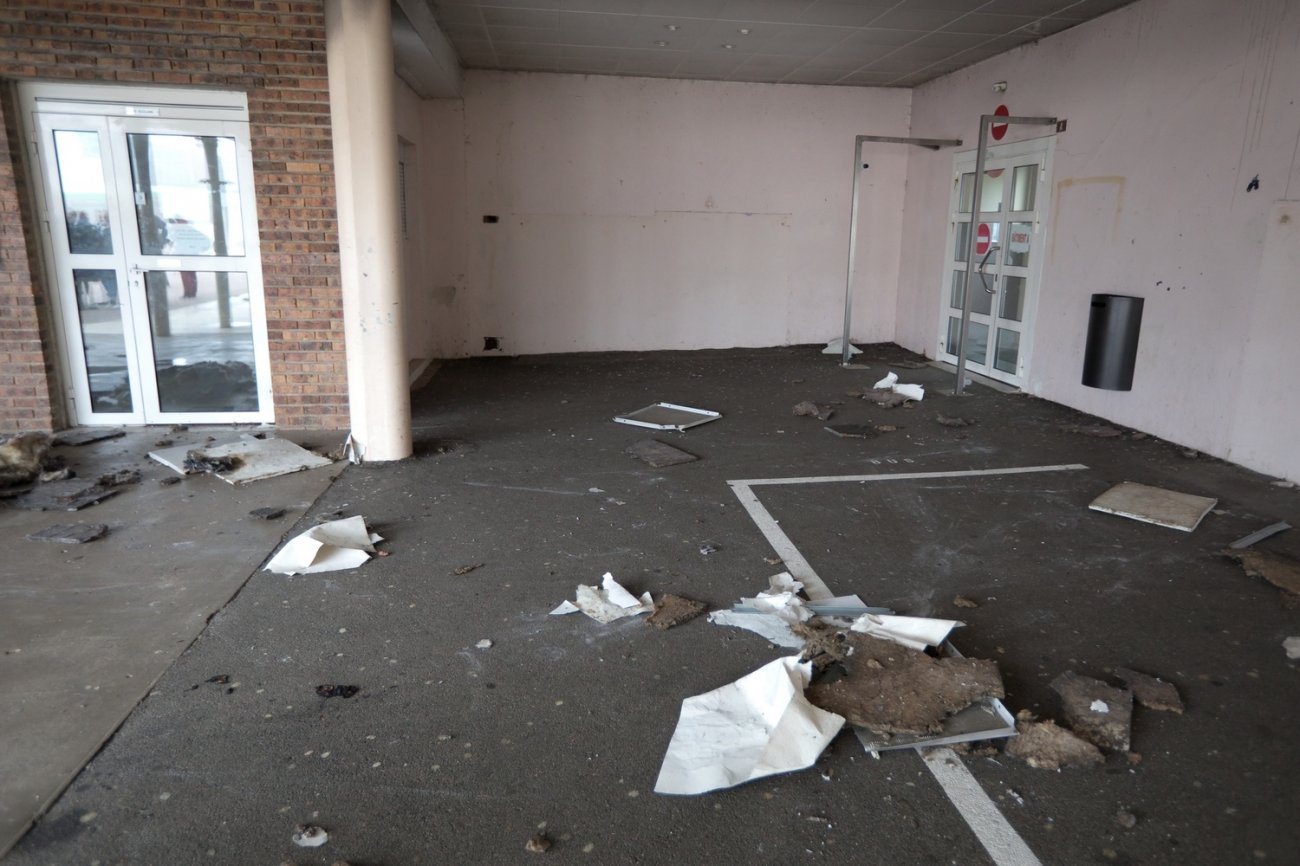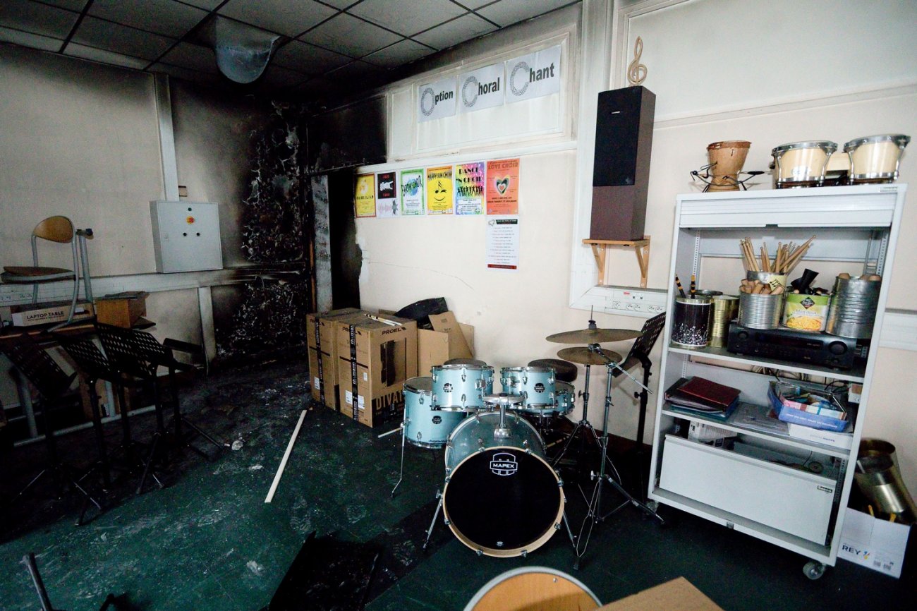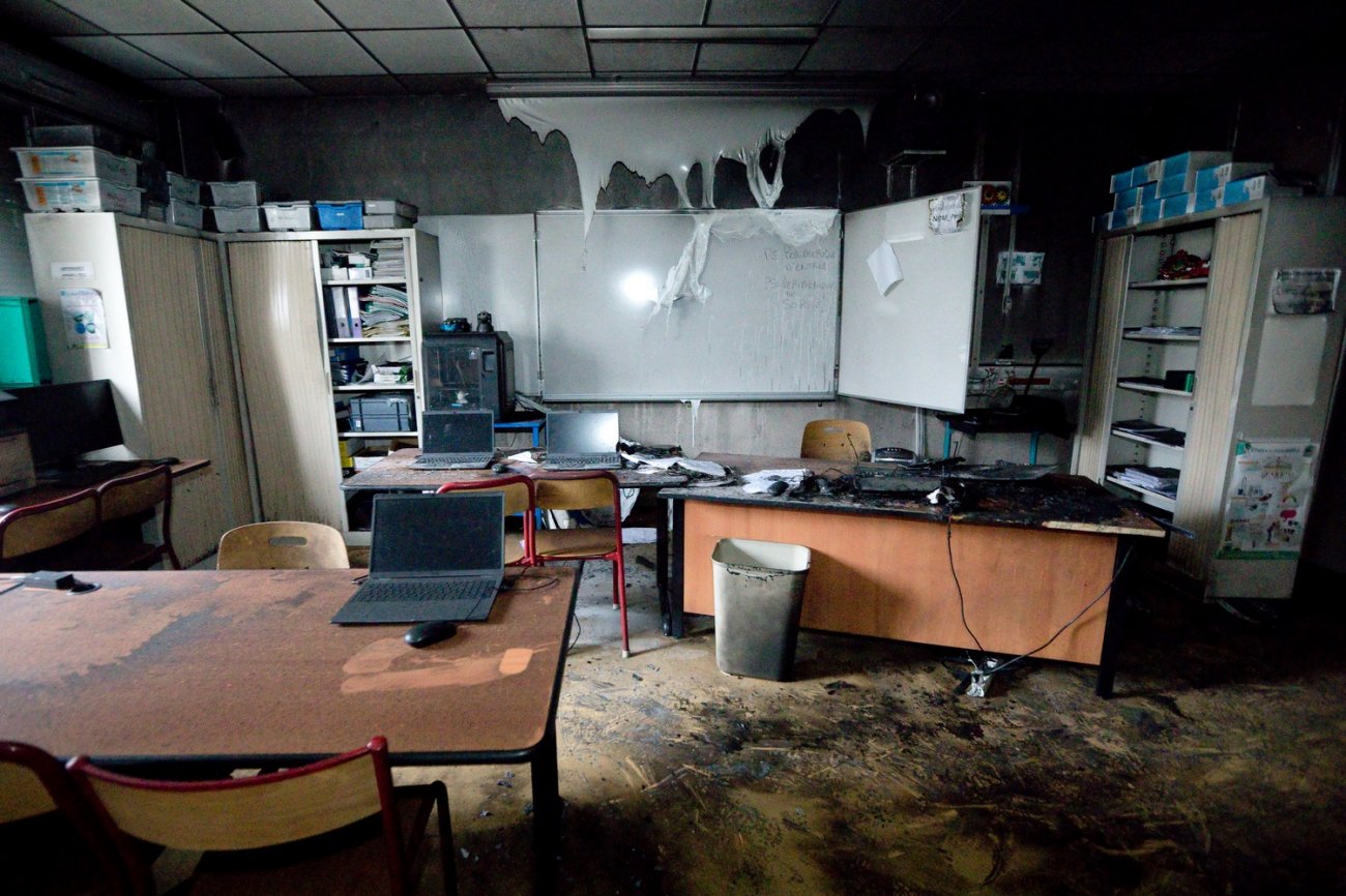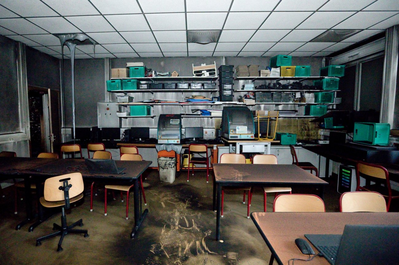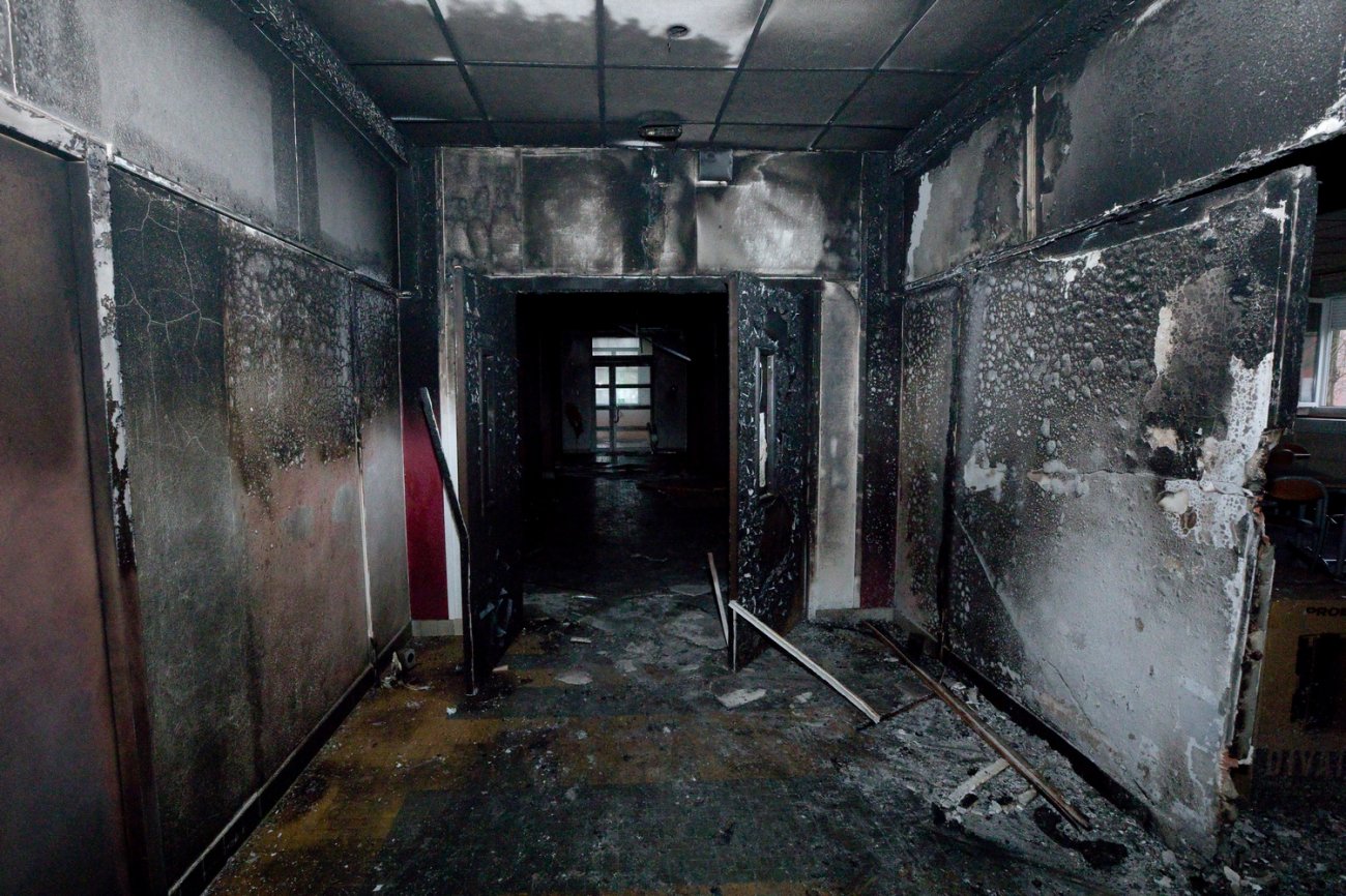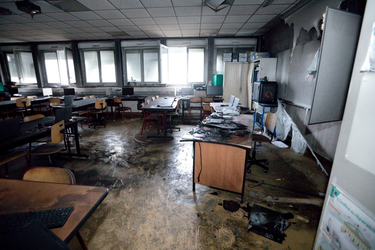Le couloir du rez-de-chaussée est ravagé et plusieurs salles – dont la salle de technologie – sont très endommagées.