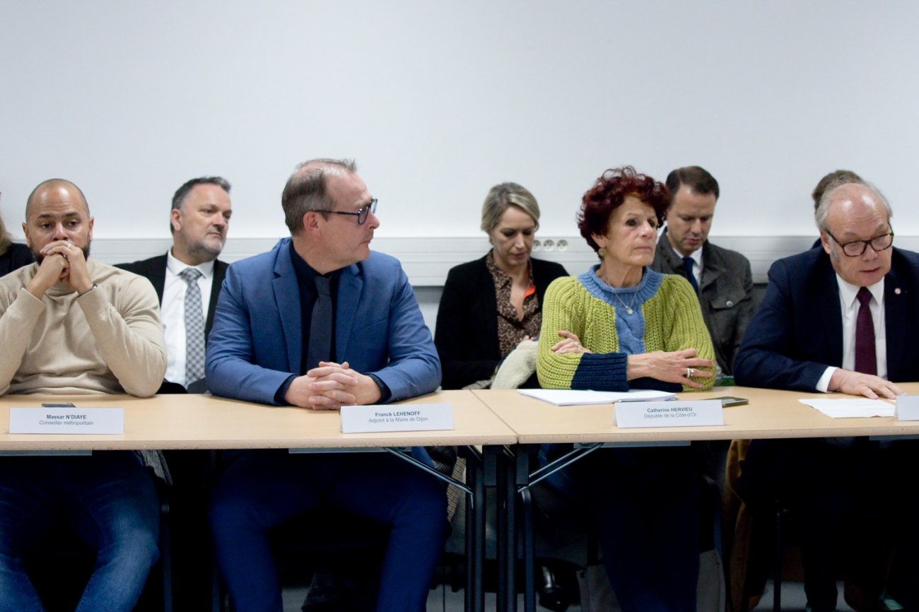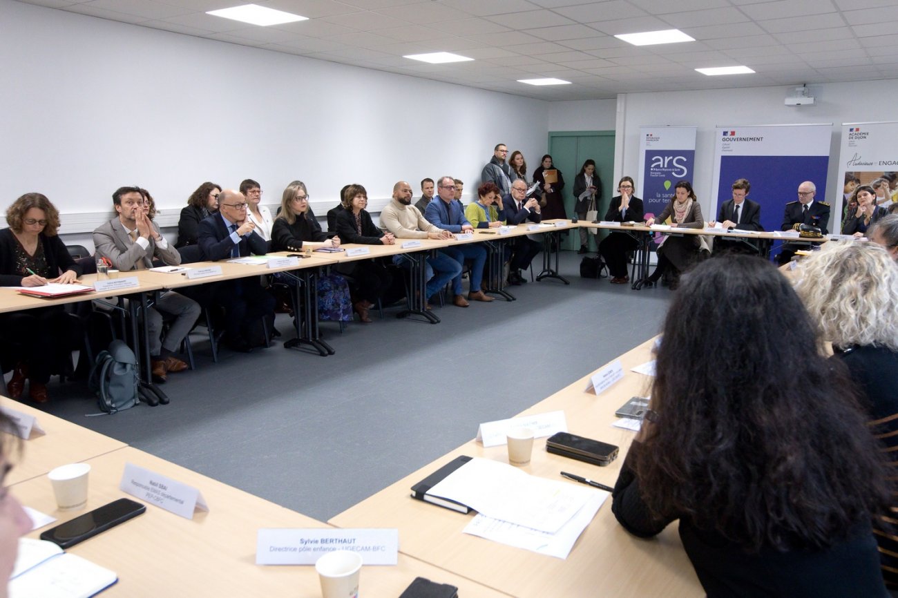 Accompagnés par le préfet de la Côte-d'Or Paul Mourier, les ministres ont été reçus au collège Gaston Bachelard par Pierre Pribetich (PS), député de la Côte-d'Or et conseiller municipal de Dijon, Océane Godard (PS), députée de la Côte-d'Or, Catherine Louis (LCOP), vice-présidente du Département de la Côte-d'Or, Franck Lehenoff (PS), adjoint au maire de Dijon, Massar N'Diaye (sans étiquette), conseiller métropolitain et conseiller départemental d'opposition, Mathilde Gollety, rectrice de l'académie de Dijon, Mathilde Marnier, directrice générale de l'agence régionale de santé Bourgogne-Franche-Comté, Virginie Gaiffe, directrice territoriale de l'ARS en Côte-d'Or, et Sandrine Durney, principale du collège Gaston Bachelard. Catherine Hervieu (LE), députée de la Côte-d'Or, a rejoint la réunion durant les échanges.