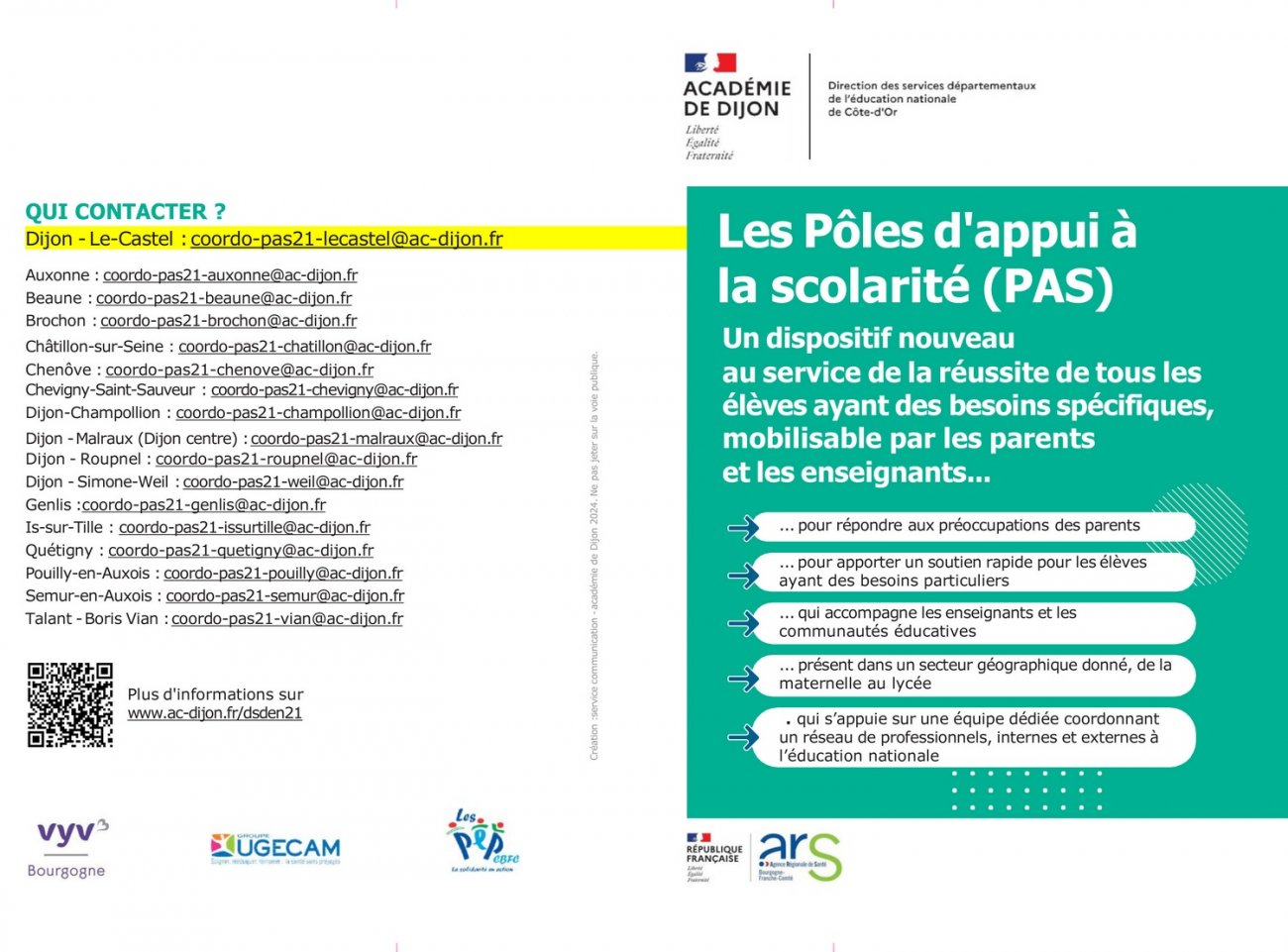 Les pôles d'appui à la scolarité associent l'Éducation nationale, l'agence régionale de santé, les collectivités territoriales, les professionnels de la santé et du secteur du médico-social ainsi que les familles. En Bourgogne, la Côte-d'Or compte 17 PAS. Depuis la rentrée 2025, la Nièvre a vu la création de 8 PAS.