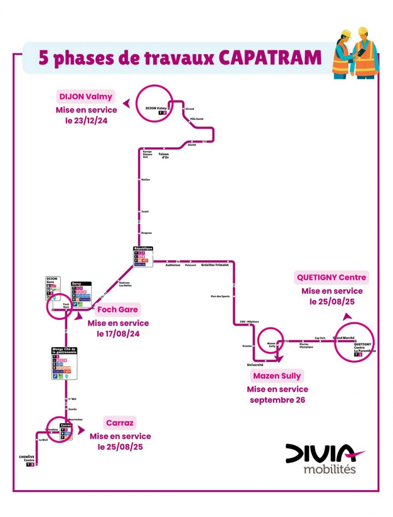 > Été 2024 : Travaux sur les zones Carraz et Foch Gare avec des modifications optimisant le trajet des trams.