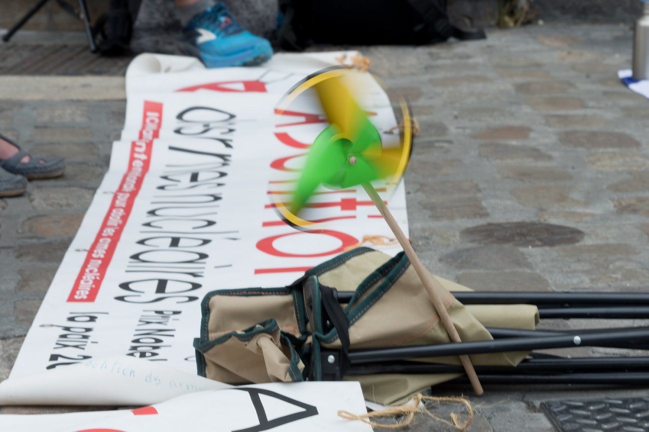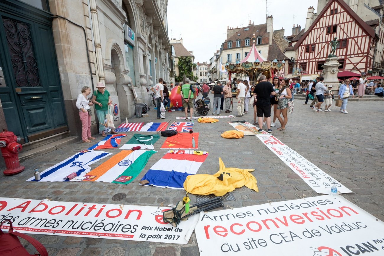 Autour des manifestants, étaient étalés sur les pavés de la place François-Rude les drapeaux des neuf puissances nucléaires : États- Unis, Russie, Chine, France, Grande-Bretagne, Inde, Pakistan, Corée du Sud et Israël. Au-dessus d'eux, un ballon en forme de bombe flottait dans les airs comme pour rappeler une menace qui plane.
