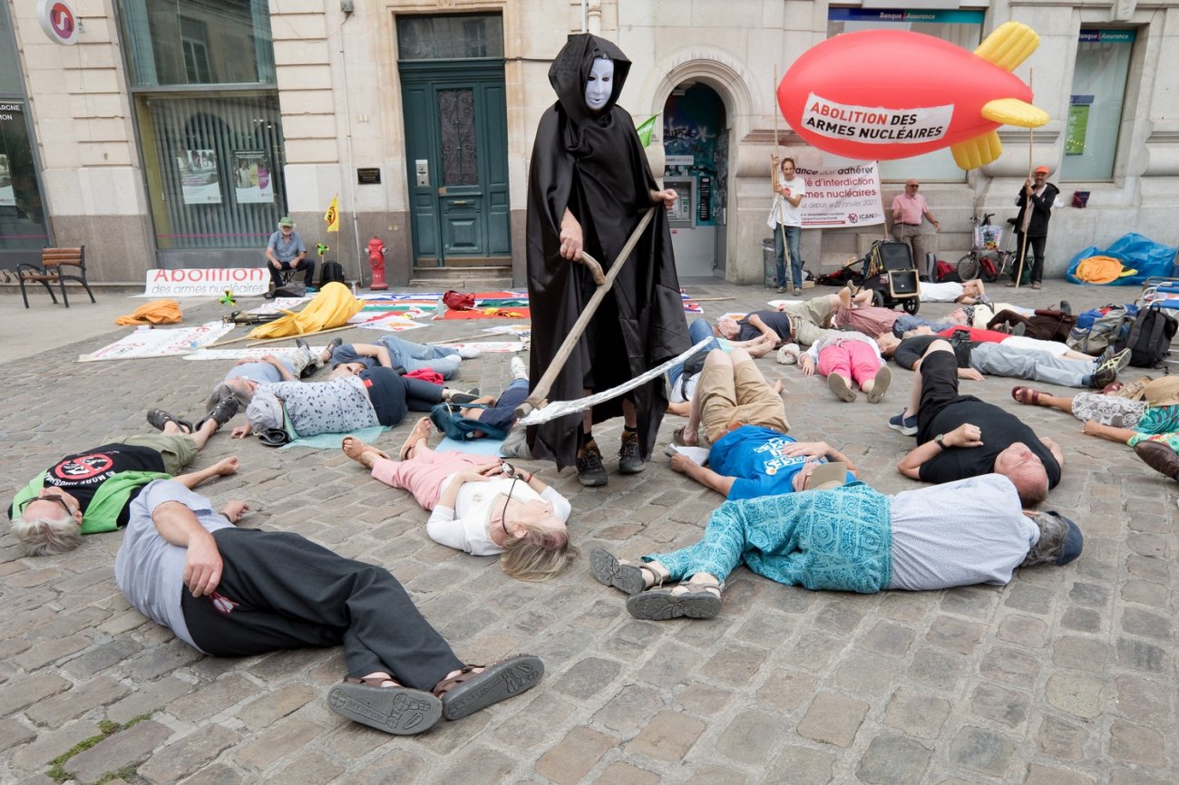 die-in, les manifestants s'allongeant sur les pavés pour symboliser les vies fauchées par les bombardements atomiques et les conséquences sanitaires des essais nucléaires.