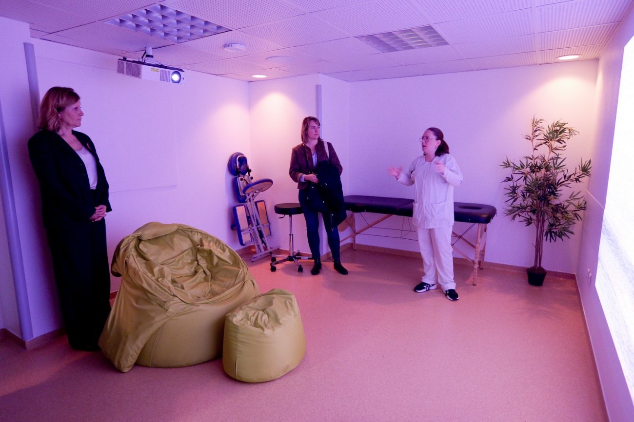La présidente de l'Assemblée nationale découvre également la salle d'apaisement Wavecare, ouverte en 2021. Cette salle associe des effets lumineux et des effets sonores à la projection de films pour stimuler les sens visuels et auditifs dans un but de relaxation. Le patient peut choisir un programme sur une tablette numérique.