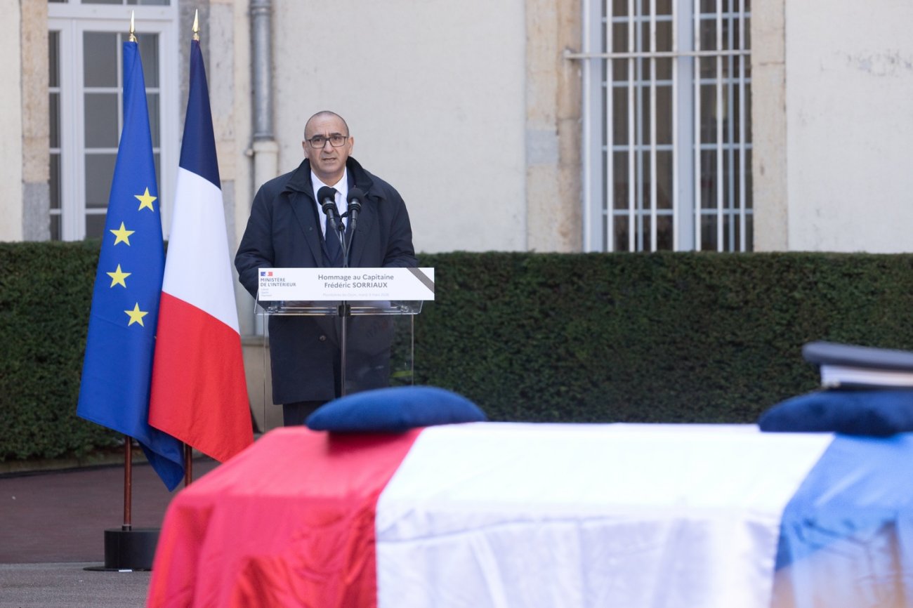 Face au cercueil recouvert d'un drapeau tricolore, le membre du gouvernement a salué «l'engagement d'une vie» de Frédéric Sorriaux – qui, entré dans la Police nationale en 2002, avait rapidement intégré les CRS –, insistant sur son «professionnalisme» et sa «passion». «Comme souvent dans ces unités spécialisée à haute technicité, la mission se confond avec la vocation et le cœur du métier est, bien souvent, le métier du cœur.»