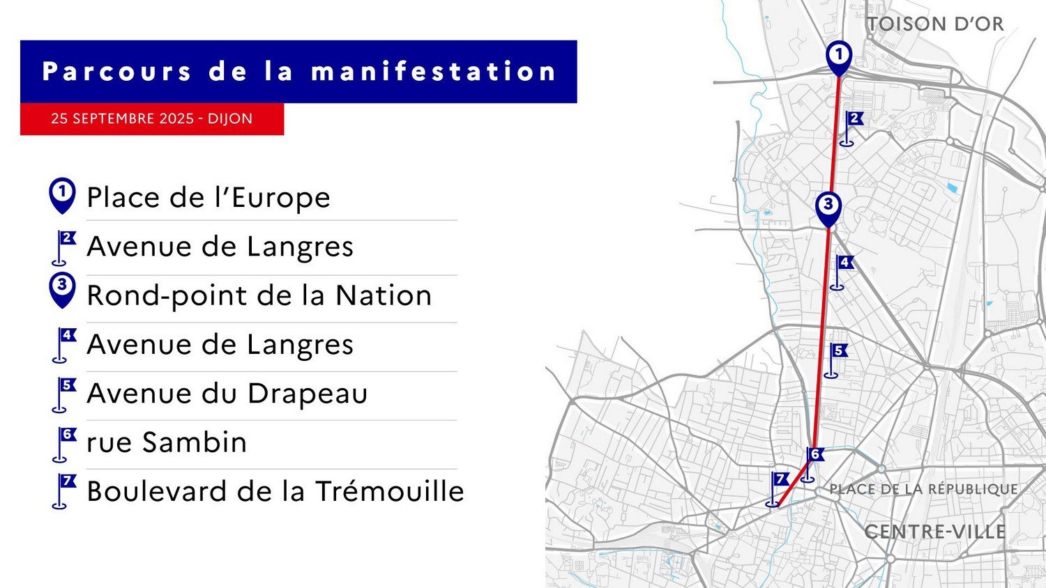 Compte-tenu du parcours emprunté ensuite, par plusieurs dizaines d'engins agricoles, entre la Toison d'Or et le boulevard de la Trémouille, d'importantes difficultés de circulation et des perturbations des lignes de tram sont à prévoir dans les secteurs Toison d'Or et République.